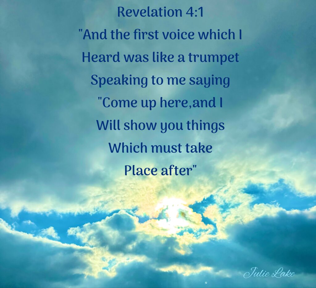 I absolutely love the moment when John, representing us, is lifted into heaven and sees the earth’s future. Revelation 4:1 captures it beautifully: “And the first voice which I heard was like a trumpet speaking with me, saying, ‘Come up here, and I will show you things which must take place after this.”