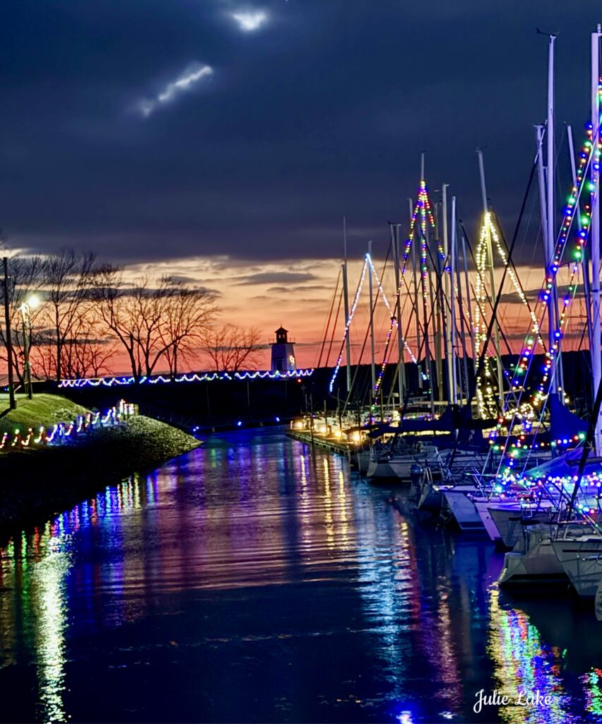 Along the waters edge lies the marina, sparkling with countless lights adorning all the masts, those sailboat poles that mirror brightly on the calm water, reflecting a kaleidoscope of reds, greens, and blues, inviting you to linger a little longer to soak in the breathtaking sight.